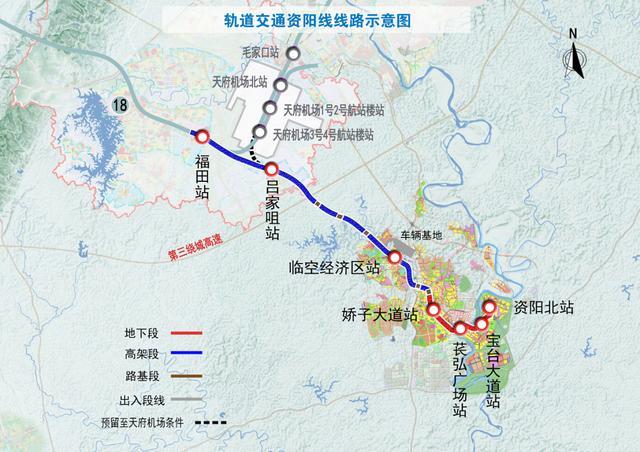 线路全长约38.69公里,共设置车站7座,其中高架站3座(福田站、吕家咀站、临空经济区站),地下站4座(娇子大道站、苌弘广场站、宝台大道站、资阳北站),全线估算总投资约133.84亿元。根据目前各项工作的推进进度,拟于2020年12月底前开工建设,预计2024年底通车试运营。